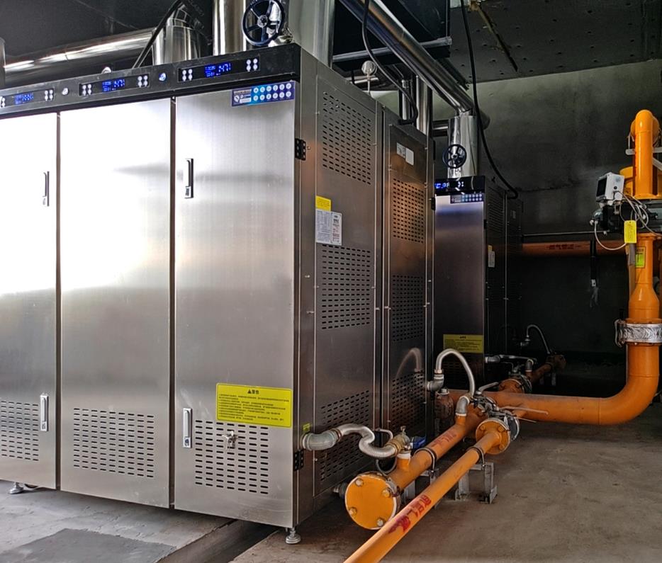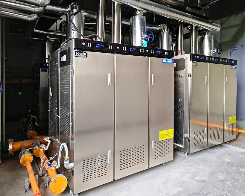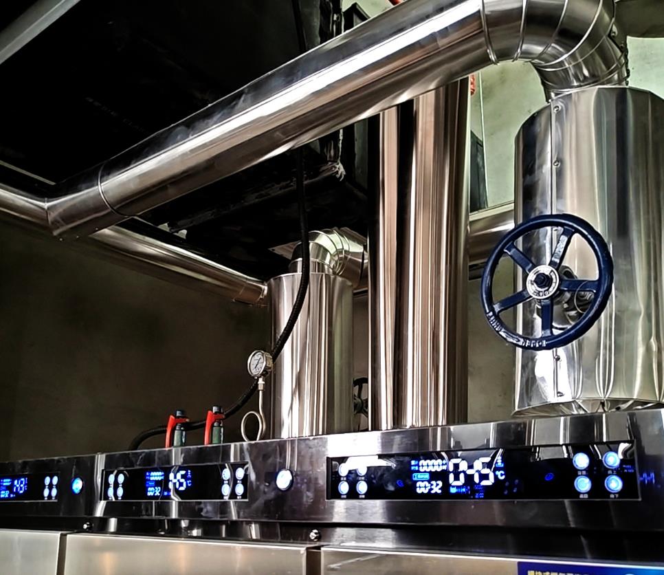 廣州逅廚食品加工客戶,由我們設(shè)計施工的1.6噸蒸汽項目,今天過來調(diào)式,我們現(xiàn)直奔設(shè)備間,采用多臺卓益蒸汽發(fā)生器,模塊化設(shè)計,潔凈高溫蒸汽,鋁皮保溫,安裝工藝很奈斯,4公斤蒸汽壓力,主要為洗碗機、洗框機、夾層鍋,蒸箱,洗鍋機、蒸汽回轉(zhuǎn)鍋、真空速冷機等供蒸汽!