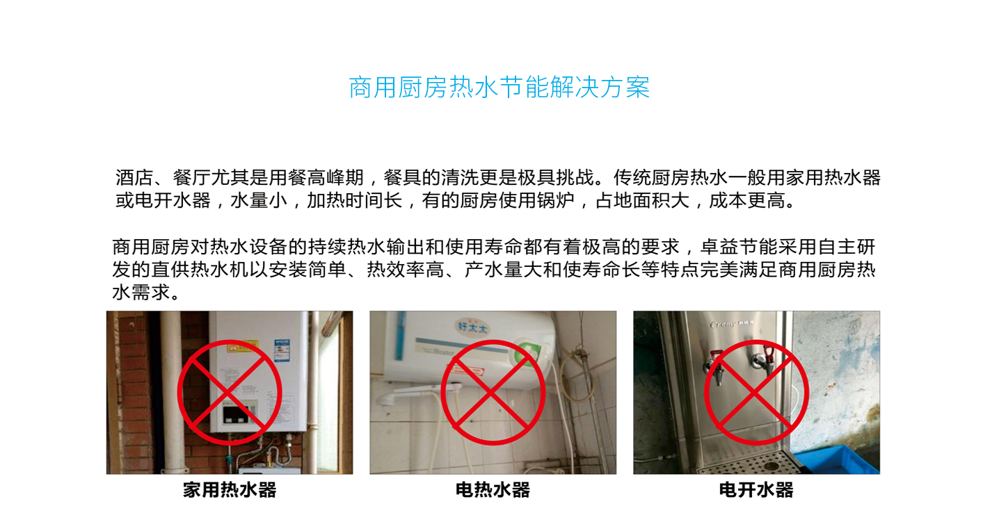 酒店、餐廳尤其是用餐高峰期,餐具的清洗更是極具挑戰(zhàn)。傳統(tǒng)廚房熱水一般用家用熱水器 或電開(kāi)水器,水量小,加熱時(shí)間長(zhǎng),有的廚房使用鍋爐,占地面積大,成本更高。 商用廚房對(duì)熱水設(shè)備的持續(xù)熱水輸出和使用壽命都有著極高的要求,卓益節(jié)能采用自主研 發(fā)的直供熱水機(jī)以安裝簡(jiǎn)單、熱效率高、產(chǎn)水量大和使壽命長(zhǎng)等特點(diǎn)完美滿足商用廚房熱 水需求。